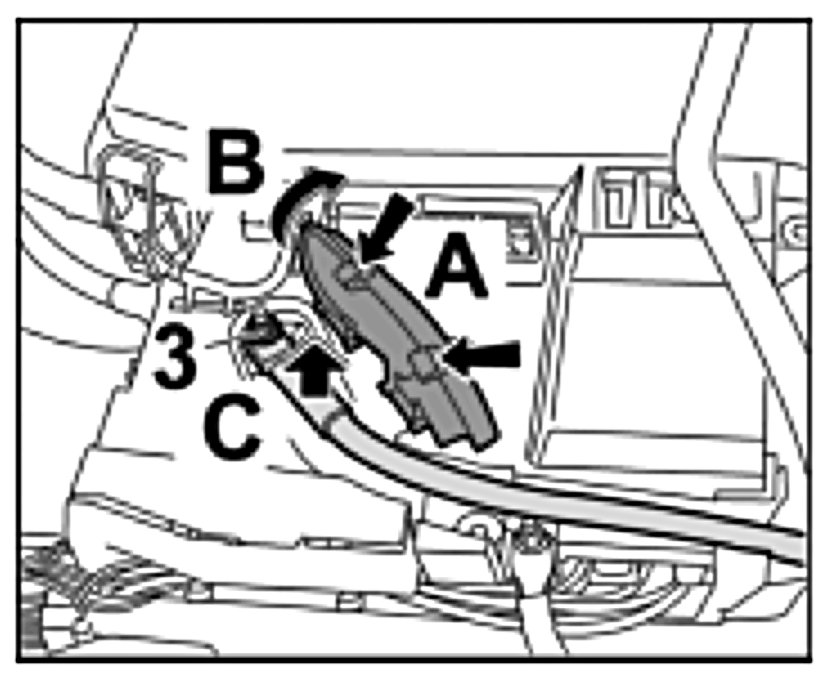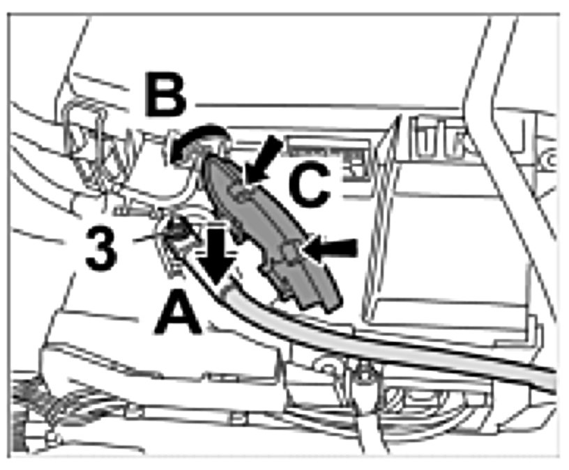 3. Place line on threaded bolt -Arrow C- and tighten using a new fastening nut. -12-. Tightening torque: 3.5 ftlb..