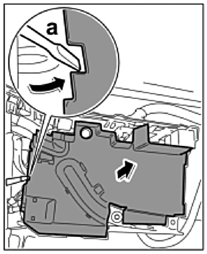 9. Lever off lid from power distributor with a screwdriver -a- and remove -arrow-.