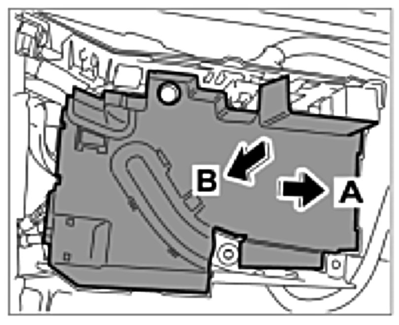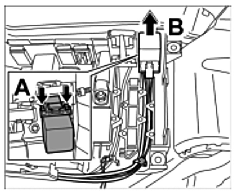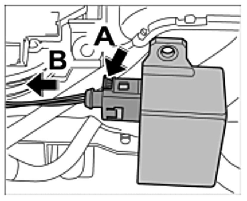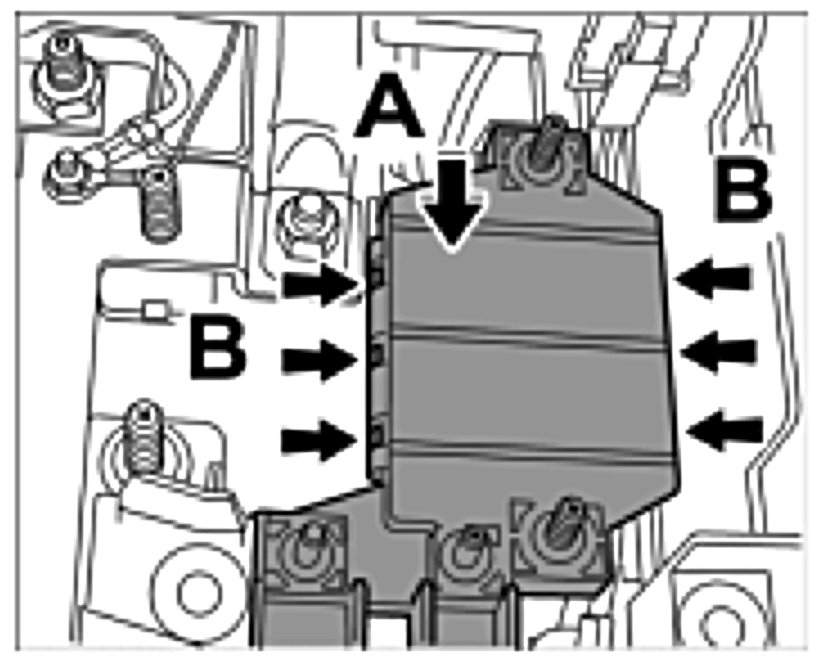 21. Push in cover of power distributor from front to back -Arrow A- and press on -Arrow B- until the latch engages.
