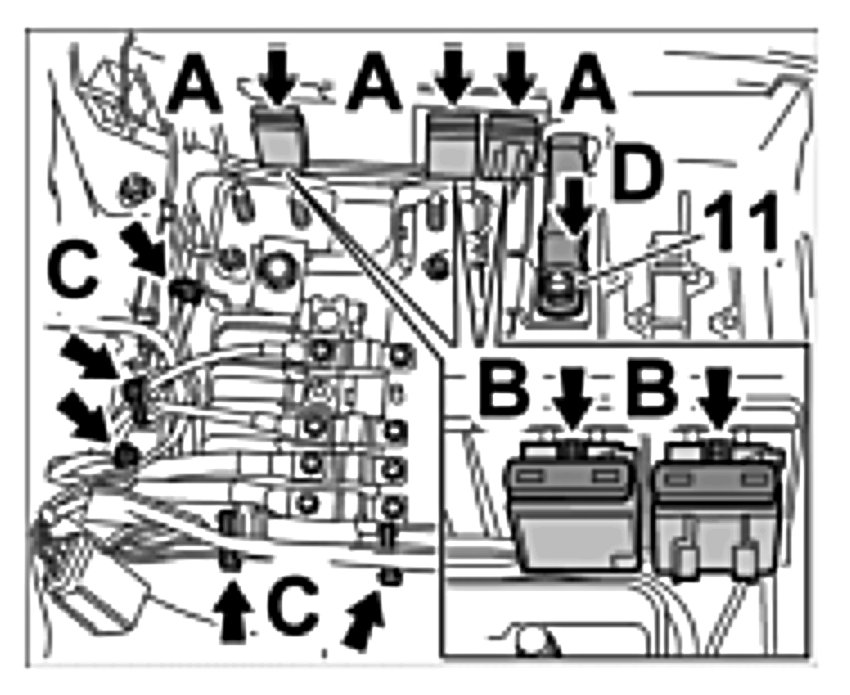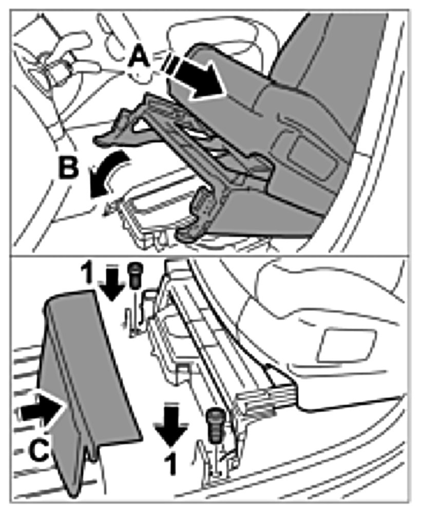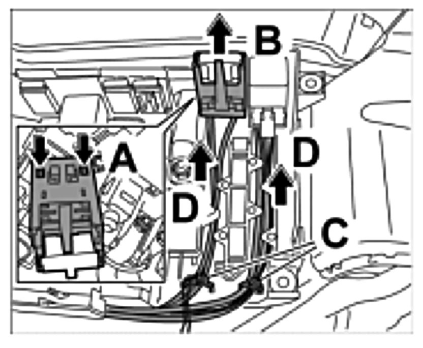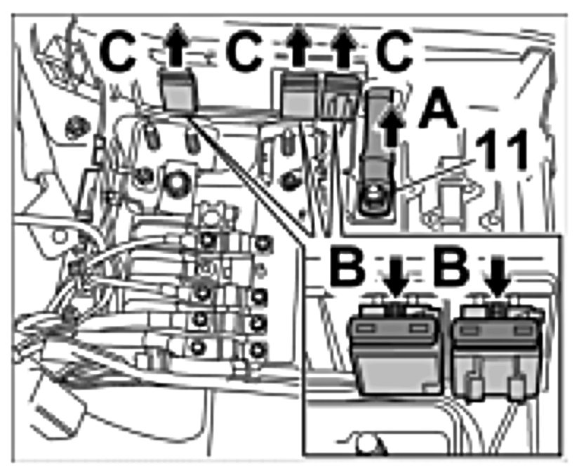 26. Release fuse carrier -Arrow B- and remove it from brackets -Arrows C-.