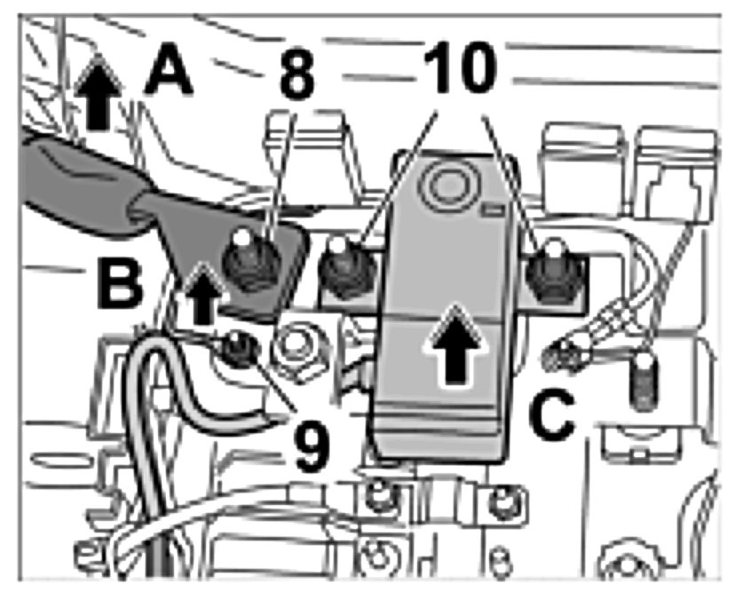 9. Place line on threaded bolt -Arrow C- and tighten with the fastening nut. -8-. Tightening torque: 12 ftlb..