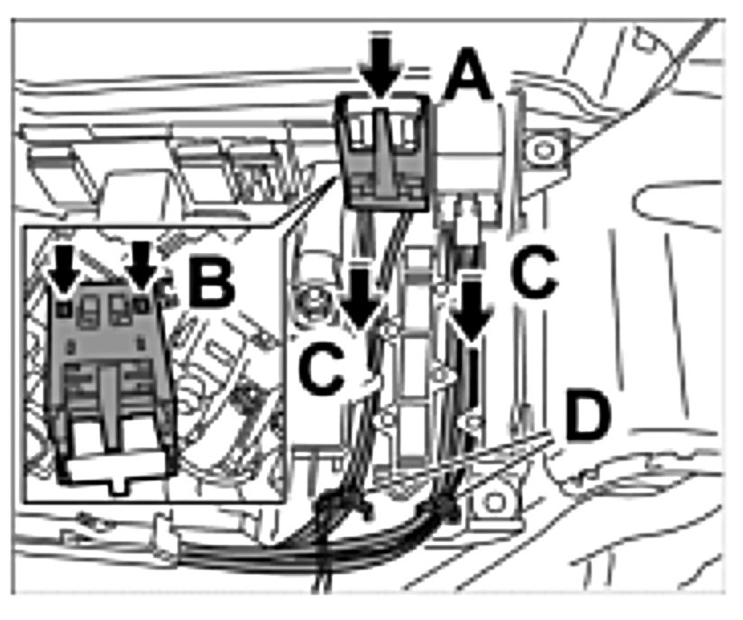 11. Tie the lines together with a new tie-wrap -C- and place plug connection in installation position -Arrow D-.