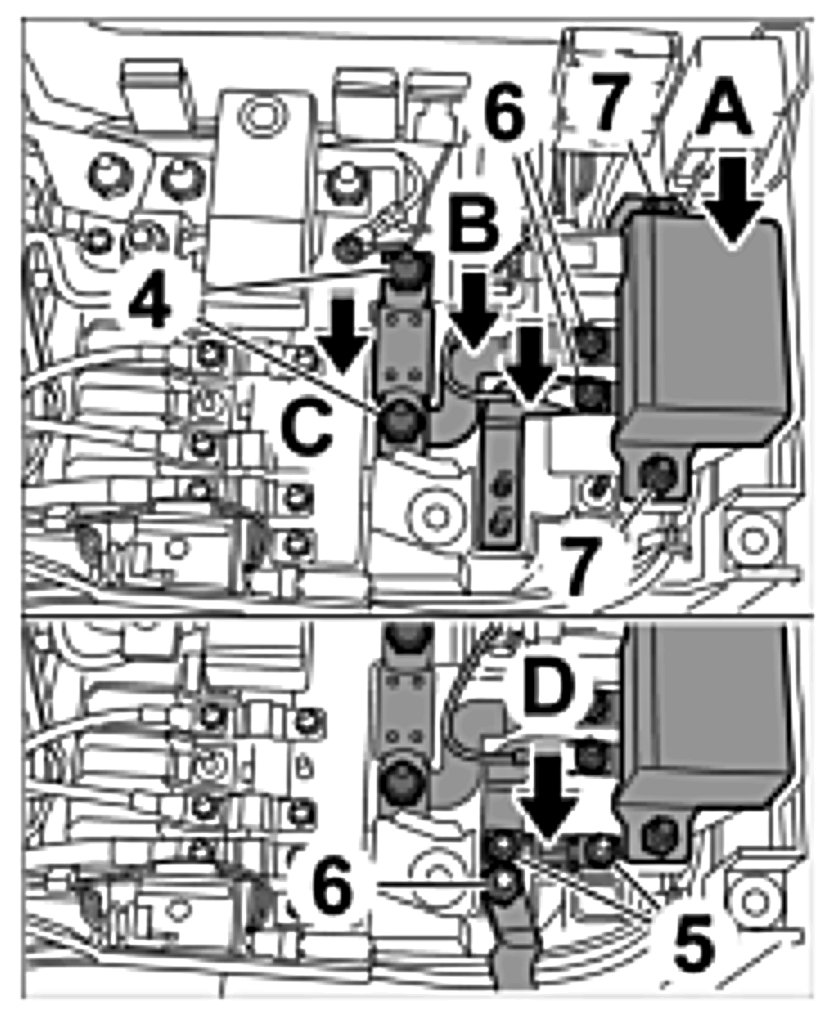 12. Undo fastening nuts -6- then remove line and contact bridges -Arrows C-.