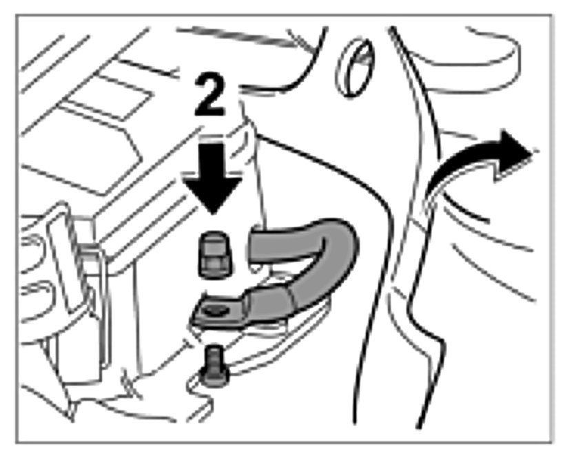 22. Push line for auxiliary battery onto threaded bolt -Arrow A- and screw down with fastening nut -3-. Tightening torque: 15 ftlb.