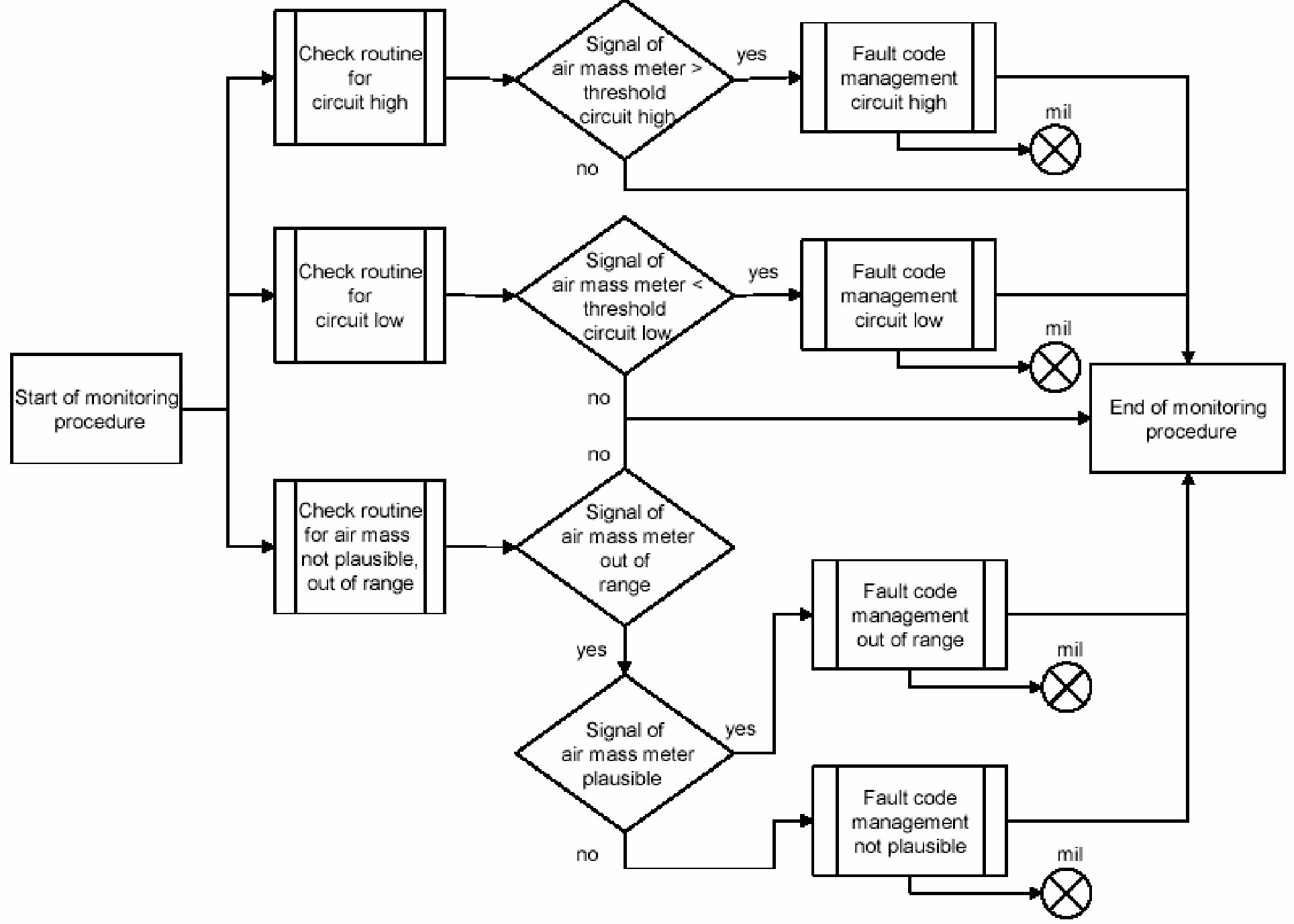 The output voltage of the air mass meter is a measure of air mass. The diagnostic routine compares the mass flow measured by the air mass meter with a calculated mass flow, derived from engine speed an throttle position.