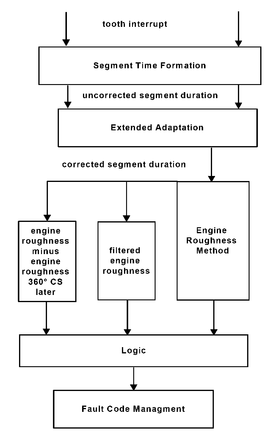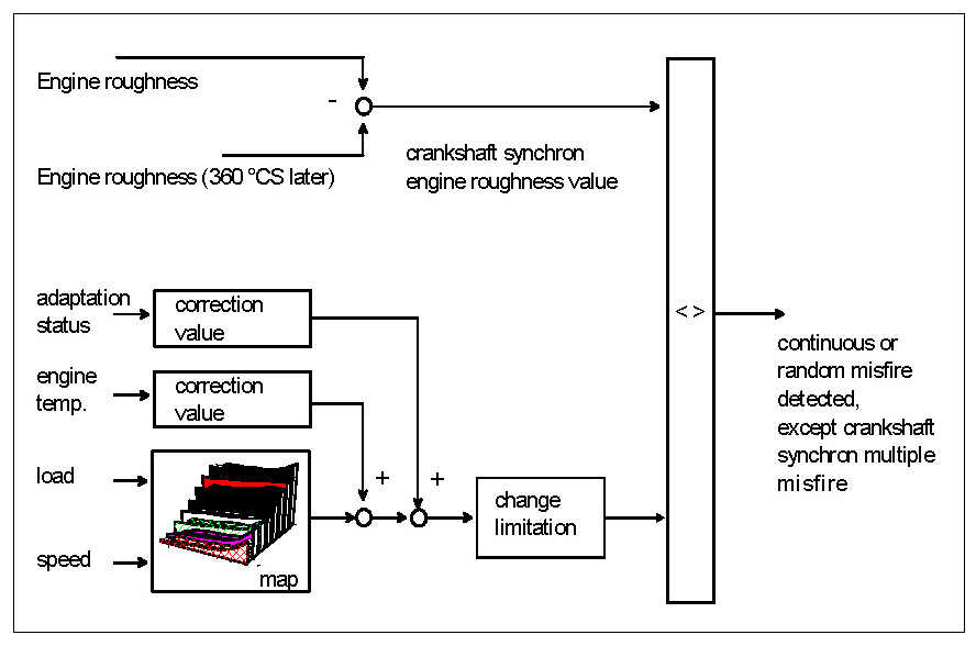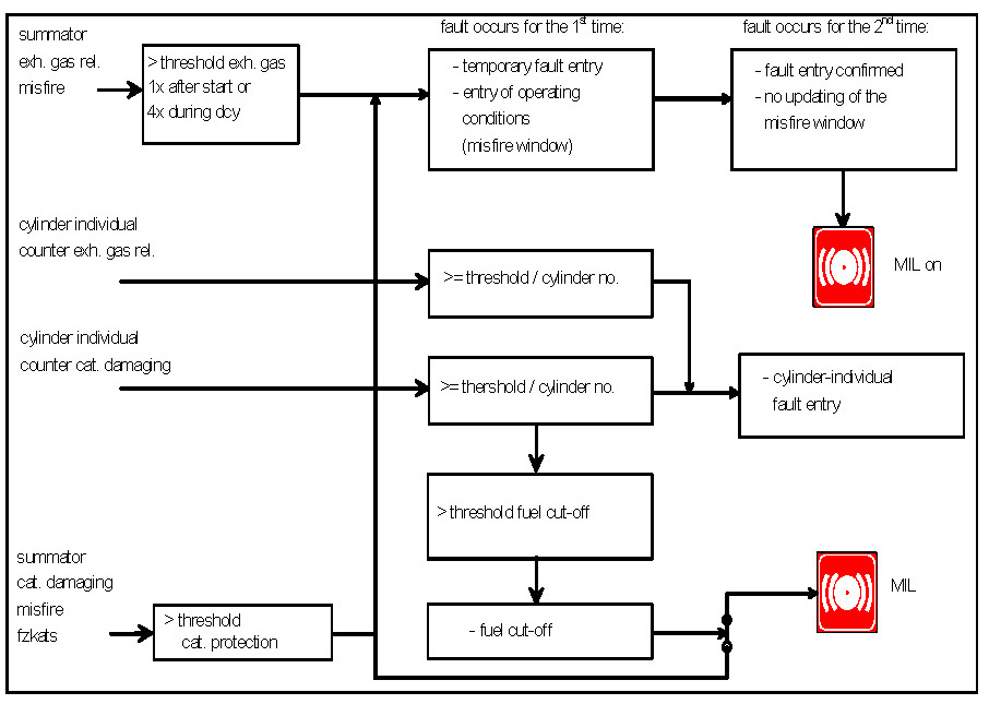 The misfire detection system consists of various sub function, which together guarantee a complete detection of all misfires, see Diagnosis of Misfire-Overview. Common to all methods is the evaluation of segment durations, which are corrected by means of an adaptation. The misfire detected by each of the individual methods are logically OR'd together and then further processed in the fault code management system. The fault code management system determines, among others, when the MIL is to be triggered.