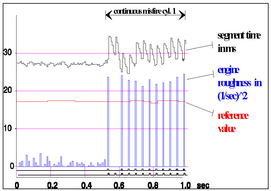 An example of continuous misfire in a single cylinder is shown in Diagnosis of Misfire - Measure with Continuous Misfire. Engine roughness is compared to a specific load / speed dependant threshold. If the threshold is exceeded misfire is detected.