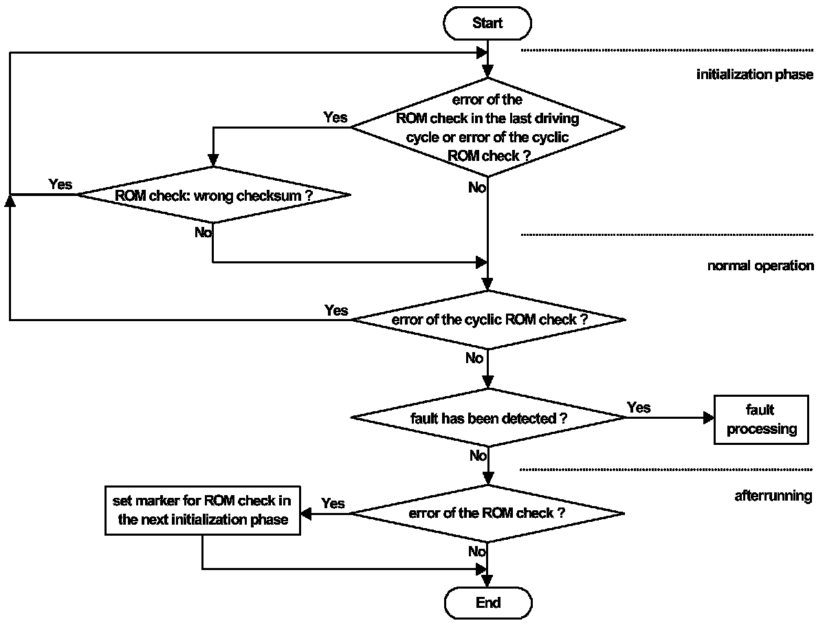 A cyclic ROM check, which checks the checksum of the function monitoring, is performed continuously. A fault detection causes a RESET with a repeated ROM check in the initialization phase, as above (see next page).