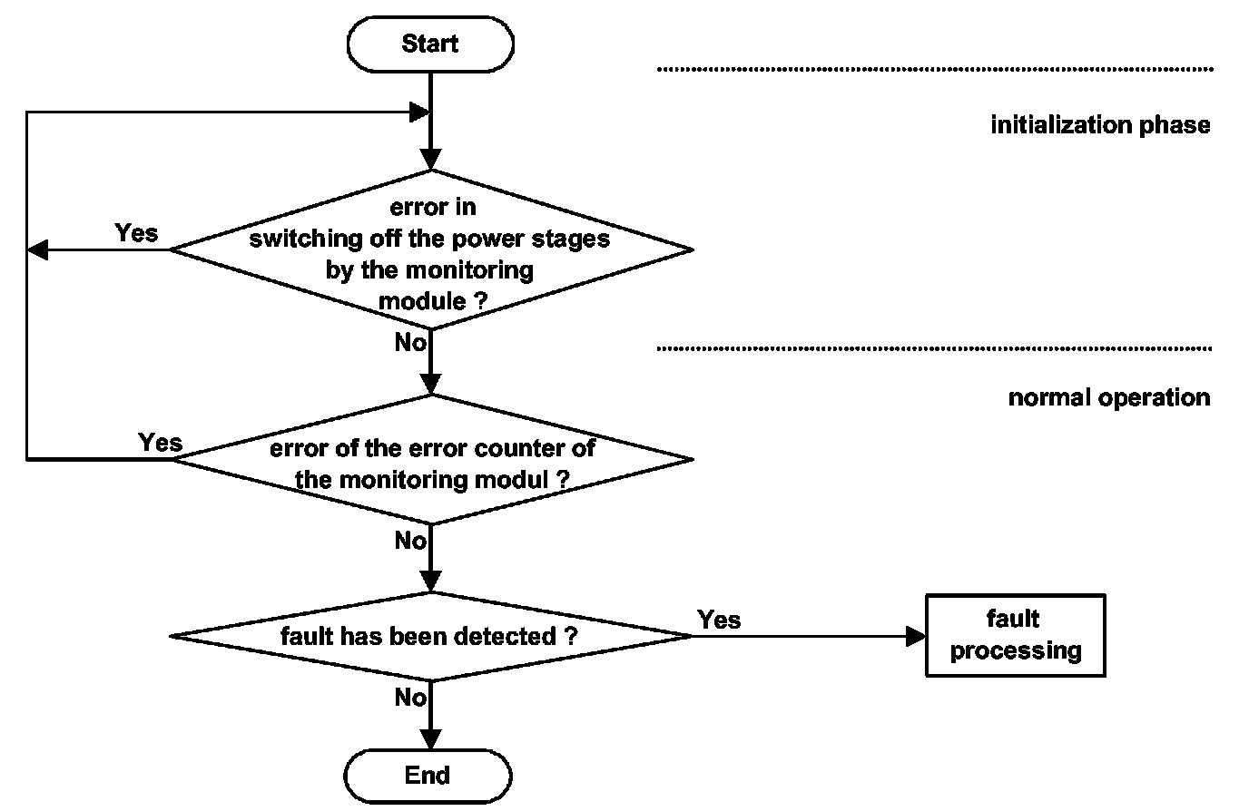The switching off of the power stages by the monitoring module is checked once per driving cycle in the initialization phase. If the switching off of the power stages by the monitoring module is impossible a RESET is performed with no function running. Only no-fault detection will lead to a normal function and storing the RST - fault.