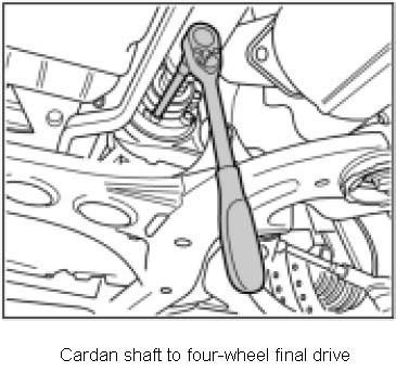 ^ To unscrew the cardan shaft bolts, a second fitter should sit in the vehicle and block the drive harness by actuating the foot brake.