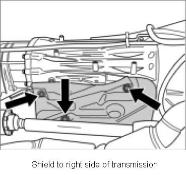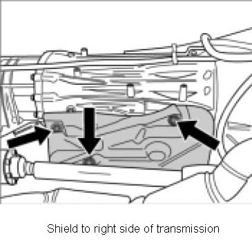 4. Install shield on the transmission. To do this, screw in three fastening screws -arrow-. Tightening torque: 7.5 ftlb.