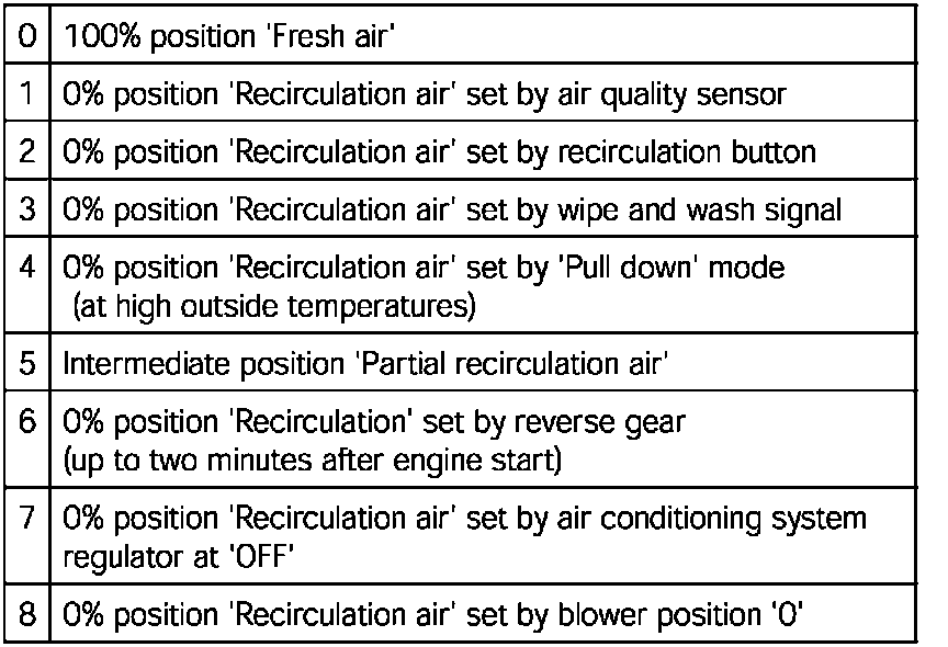 In the menu item 'Actual values', the current required position of the recirculation valve can be read out. Numbers from '0' to '8' are output. The meaning of each number is shown in the following table.