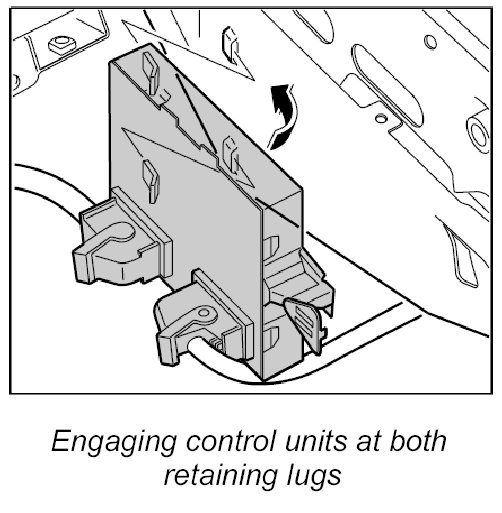 2. Engage control unit in support for wiring harness with both retaining lugs.