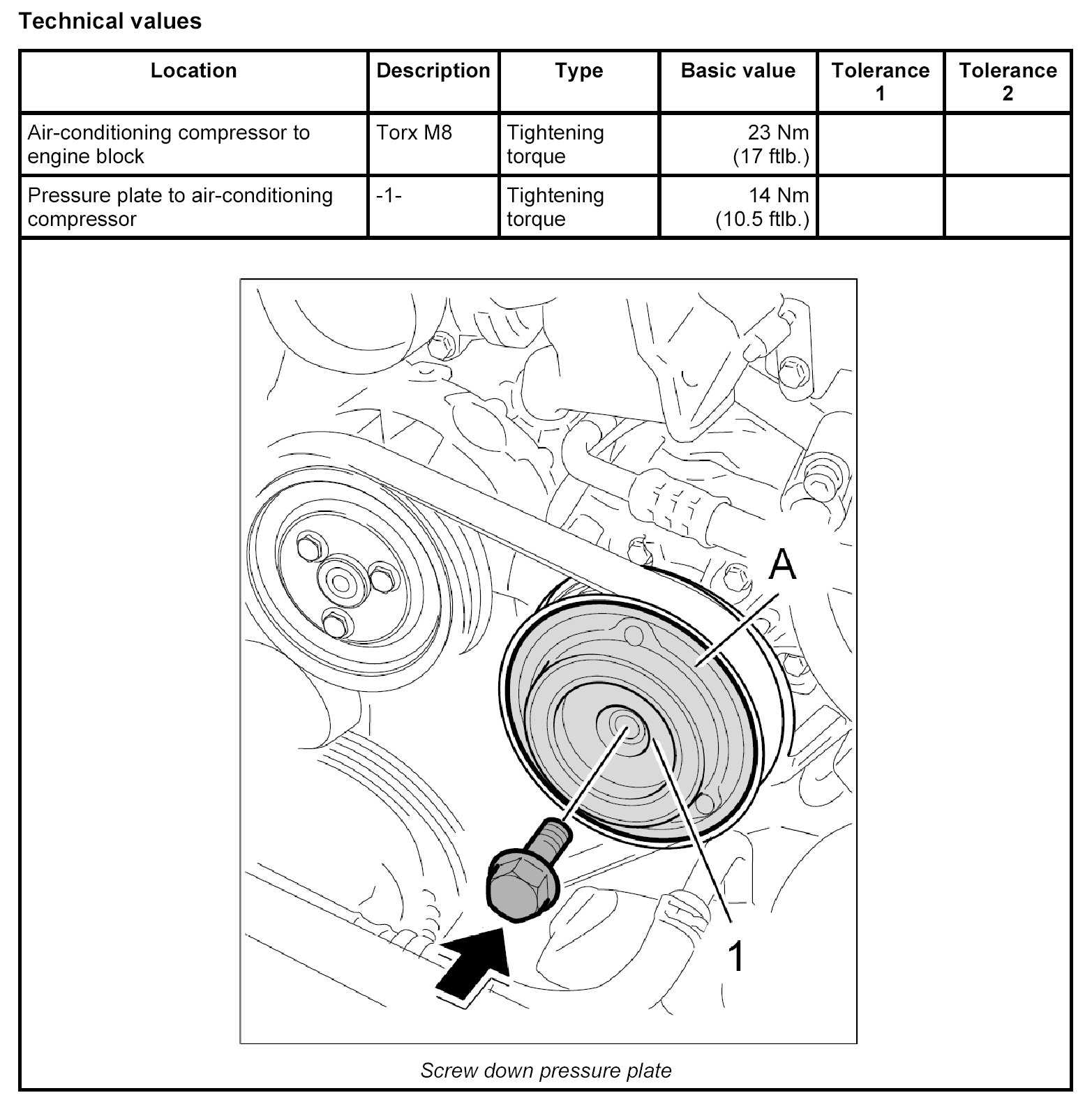5.3. Screw in rear Torx screw for air-conditioning compressor (M8 x 120) -1- and tighten all three screws for air-conditioning compressor. Tightening torque: 23 Nm (17 ftlb.).