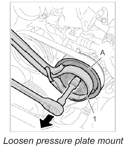 1. Use a commercially available strap wrench to securely hold the pressure plate -A- on the air-conditioning compressor, and undo the fastening screw -1-.
