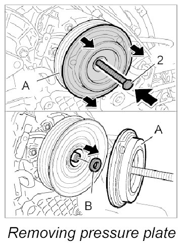 3. Take off spacers -B- behind the pressure plate.