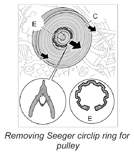 4. Use a Seeger circlip ring pliers to remove the Seeger circlip ring -E- on the pulley -C-.