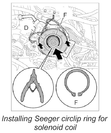 2. Position Seeger circlip ring -F- for solenoid coil -D- and install with Seeger circlip ring pliers.