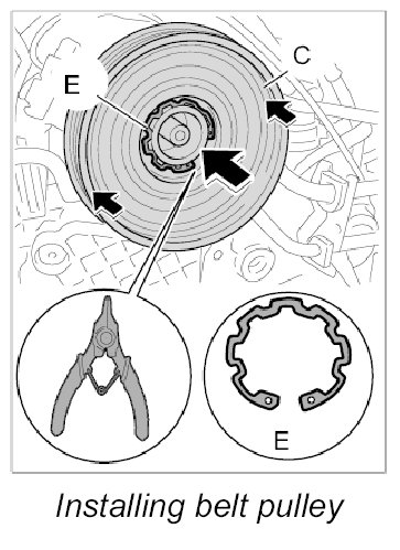 3. Position pulley -C- and install with the Seeger circlip ring -E-.