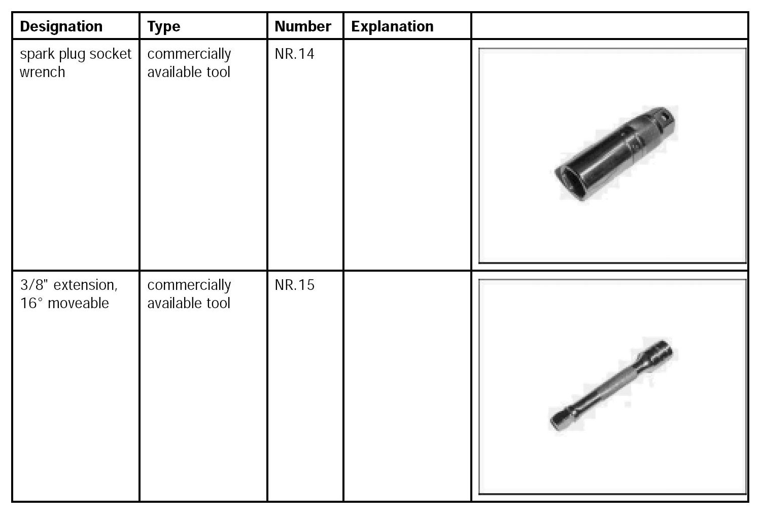 - Only use the approved tool spark plug socket wrench NR.14 and 3/8 inches extension, 16 degrees moveable NR.15.