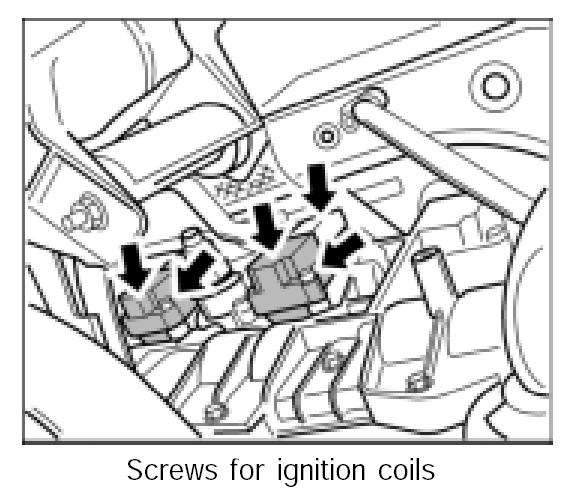 3. Unscrew two M6 x 25 fastening screws -arrow- each per ignition coil and remove the six ignition coils individually.