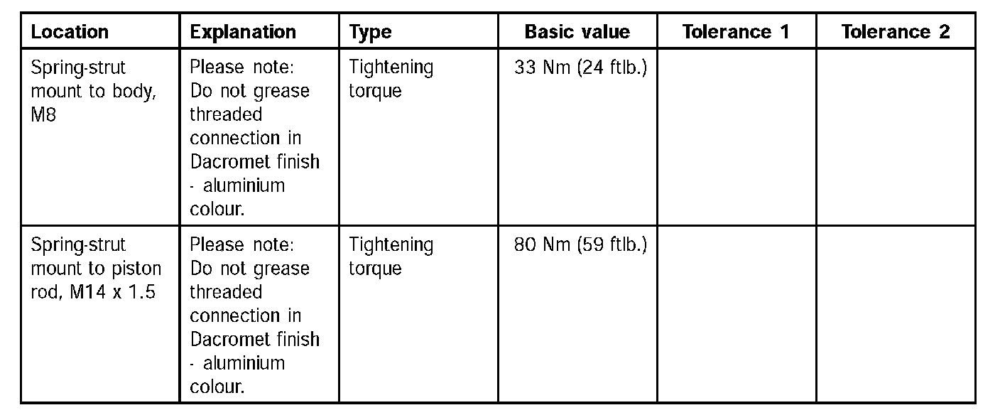 Tightening torques for spring strut