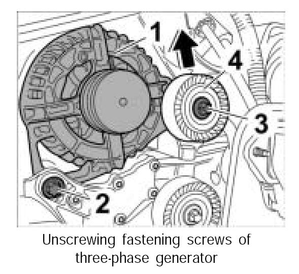 3. Remove generator -1- upwards out of the slotted support. Unscrew fastening screw -3- and remove, together with the deflection roller -4-.