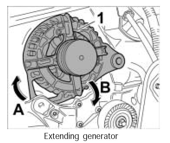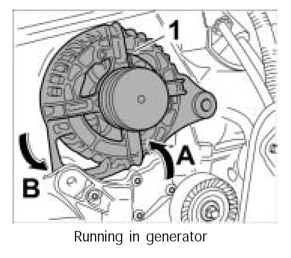 4. Turn generator -1- in an anticlockwise direction -arrow B- until the holding arm fits into its installation position behind the lug.
