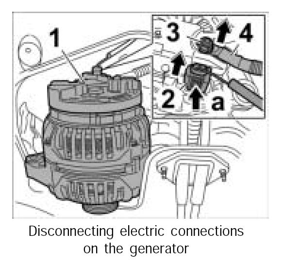 7. Unscrew fastening nut -3- for the B+ lead -4- and remove the B+ lead -4-. Remove generator -1-.