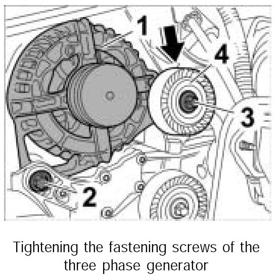 5. Insert and position fastening screw -3- and deflection roller -4- in generator-1-.