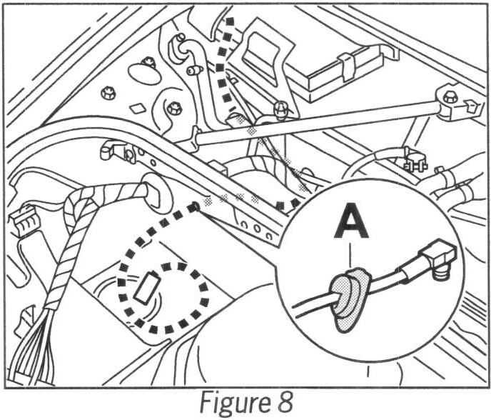 5.3.3 Route GPS antenna line --> Figure 7 -H- as follows and fix in place: Navigation unit installation position -> through rubber grommet -> along wire harness -> right plenum panel