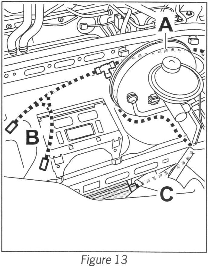 Route optical waveguide from optical waveguide connection point --> Figure 13 -A- along the front panel to the navigation unit installation position --> Figure 13 -B- and possibly to the amplifier --> Figure 13 -C- or CD autochanger and secure at this position.