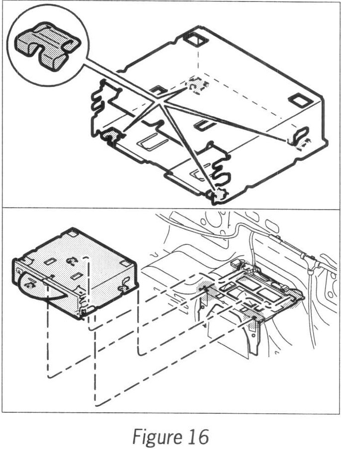 8.1.1 Fit retaining clips (997.645.342.01) on the retaining frame --> Figure 16 and slide navigation unit into the retaining frame until the navigation unit engages securely.