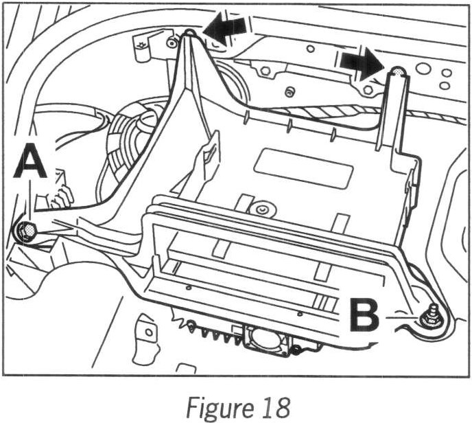 8.2.2 Press in combination holder for amplifier/navigation unit (997.645.351.00) with the two fastening parts --> Figure 18 -arrows- on the body and tighten screw (900.378.179.09) --> Figure 18 -A- and nut (900.377.018.09) --> Figure 18 -B-.
