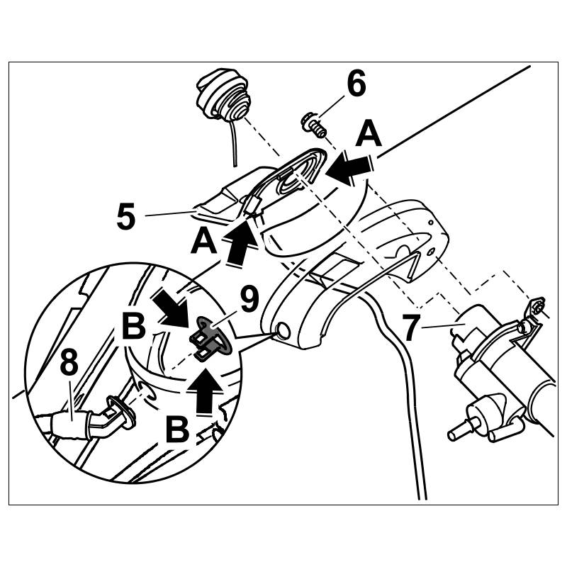 3. Remove angled pipe -8-. To do this, press apart locking tabs -B- of plastic clip -9- and remove.