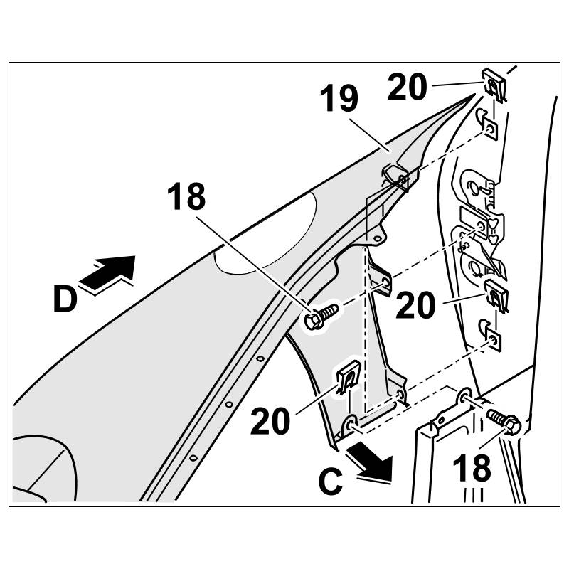 3. Position wing -19- on the body -C- and slide towards A-pillar -D-. Screw in fastening screws -18- into the A-pillar and tighten lightly.