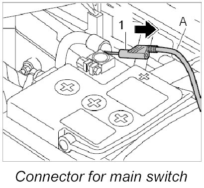 1. Pull off the B+ plug -1- for the main switch (battery disconnect switch) from the battery positive terminal.