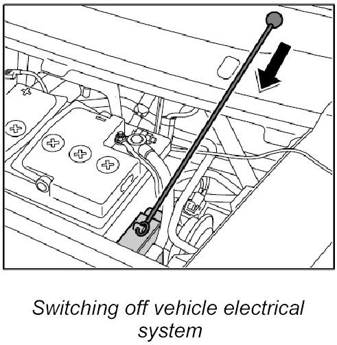 The battery disconnect switch, which is supplied via the positive terminal, is closed manually using the external switch lever and locked electromagnetically. The luggage compartment lid must not be open when doing this.