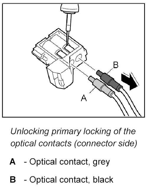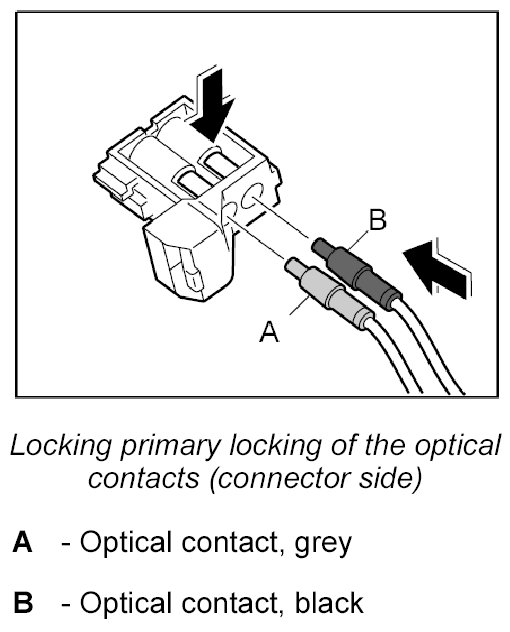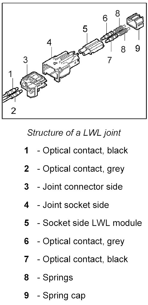 The LWL is delivered with affixed plastic contacts. These contacts are latched in the connector housing in the case of repairs. Grey and black contacts with identical mechanical dimensions are used.