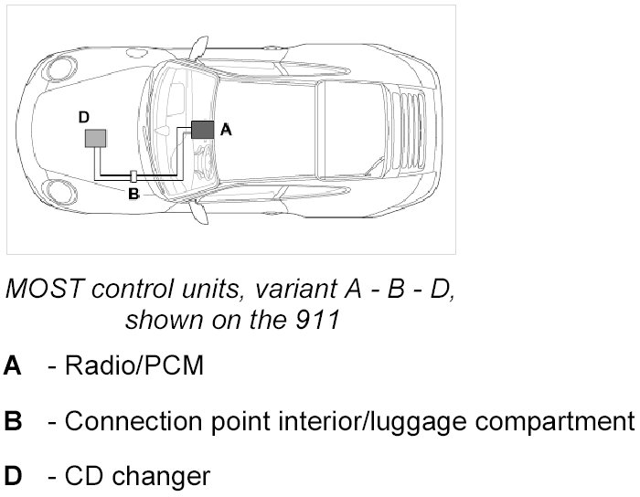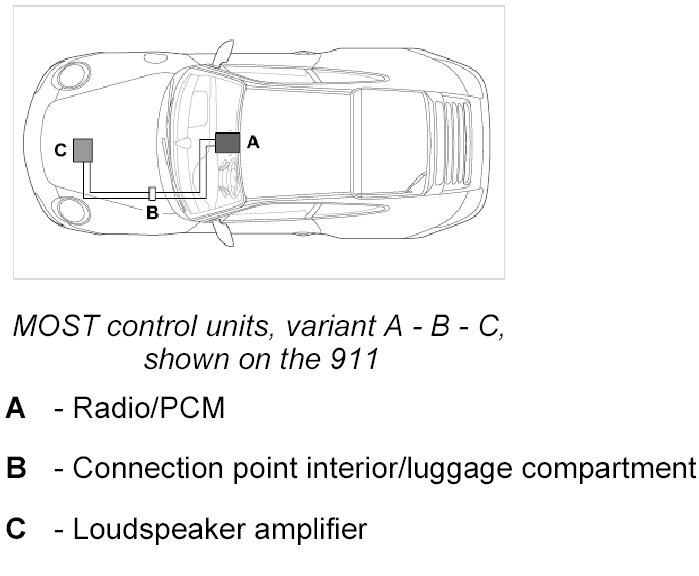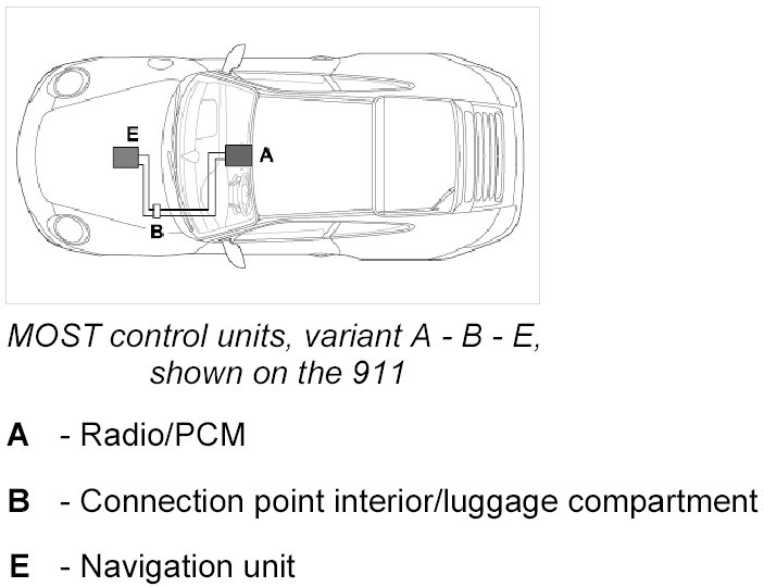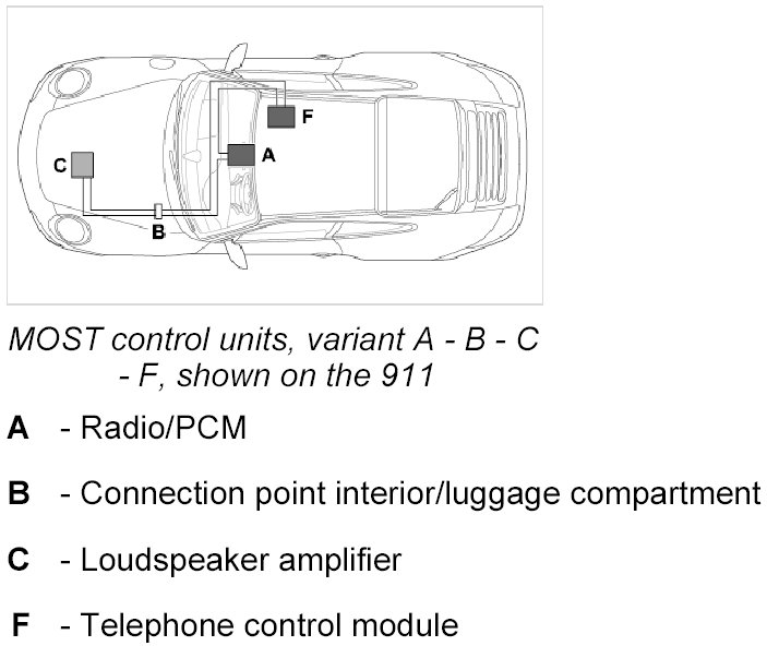 The graphic clarifies the cabling of the individual MOST control units which vary according to their equipment.