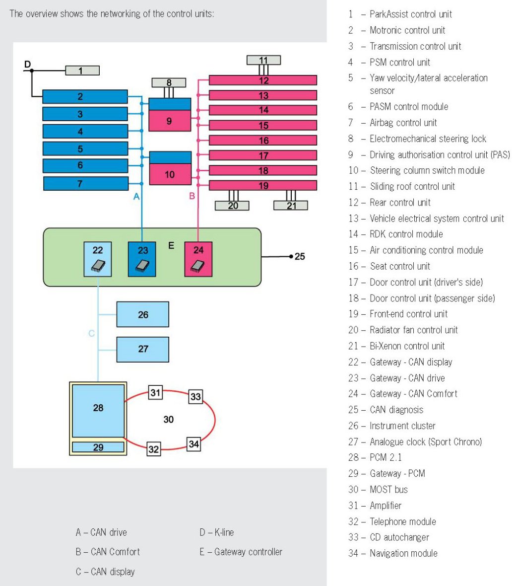 The gateway controller is actively involved with all CAN buses in the 911 Carrera. The gateway controller is a separate unit, rather than being integrated into the instrument cluster as on the Cayenne. It relays all messages and signals which are transmitted by control units for transmission via various buses. The transfer protocol of the gateway controller is defined in a so-called routing table. It also supports the test unit in diagnosing the vehicle by transmitting,