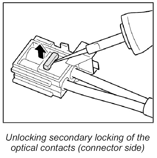 3. Position the press-out and unlocking tools for flat-type and round plug connectors of all sizes NR.155 for releasing the contact locking mechanism of the optical waveguide module and lift up the locking mechanism.