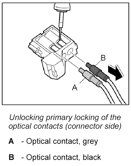 4. Carefully pull on the optical waveguide -A and B- in -direction of arrow-. If it is not possible to pull out the optical waveguide, check again if the locking mechanism is completely released.