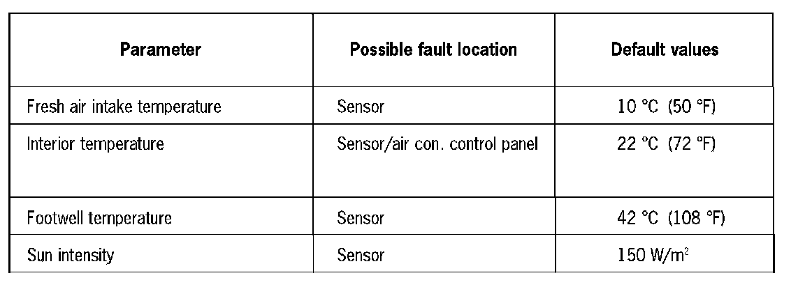 As on the previous model, in the event of a short-circuit or interruption of a sensor default values are employed to maintain operation of the a/c control system in emergency mode.
