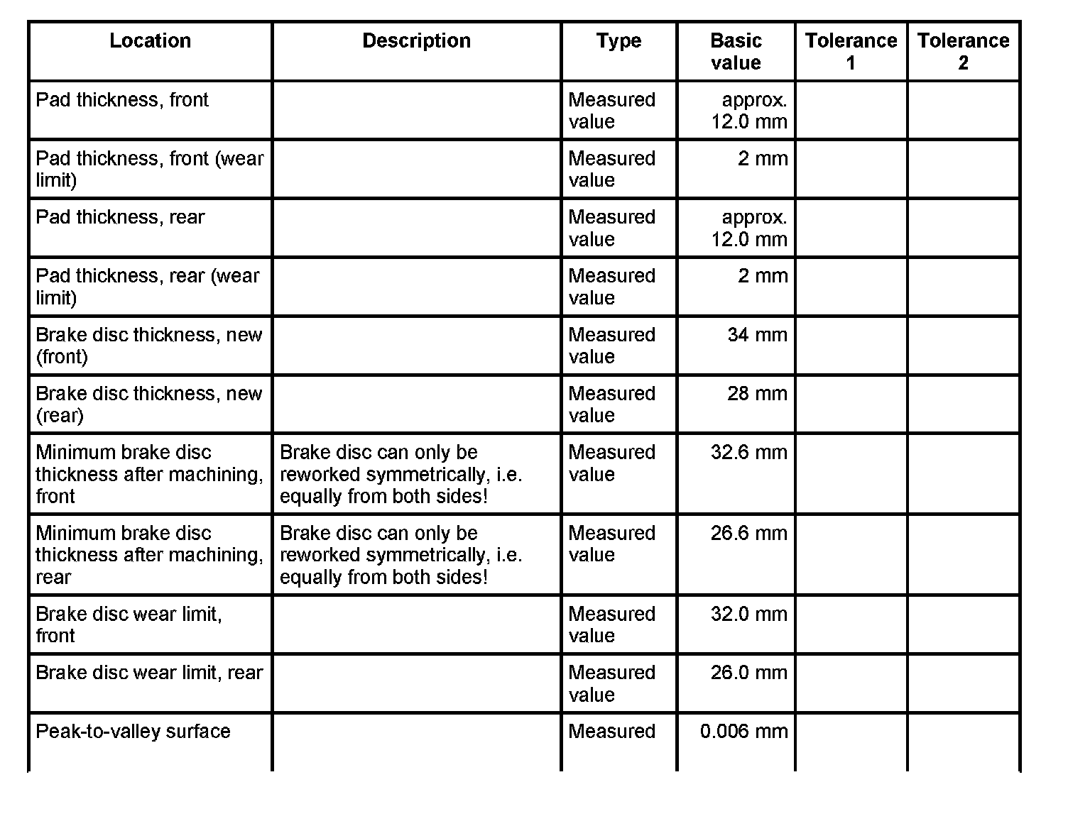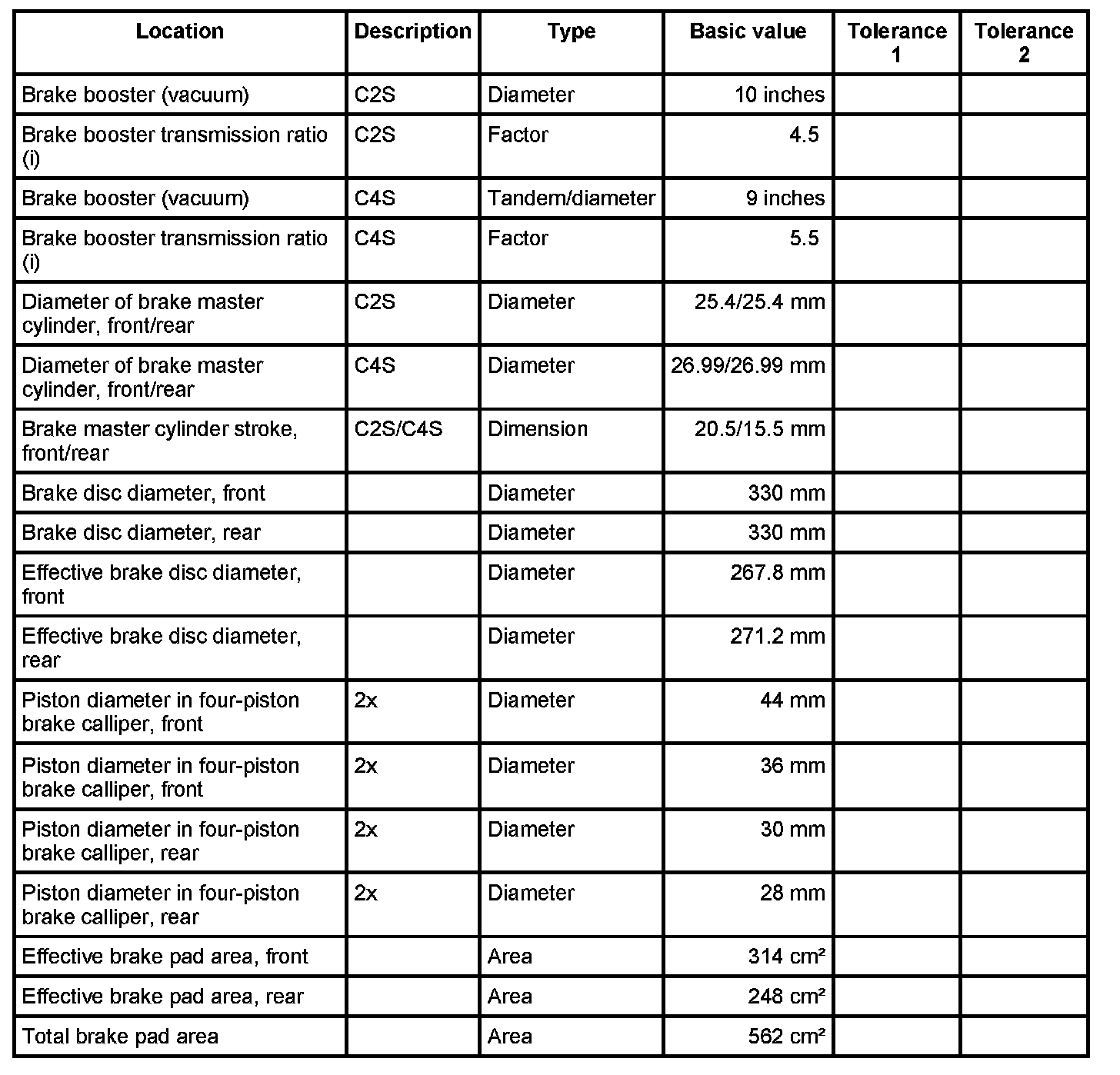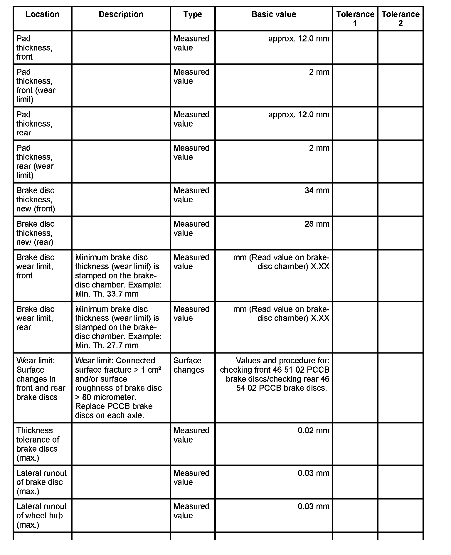 Test values/wear limits for C2/C2S and C4/C4S - PCCB brakes (option)