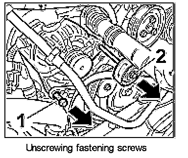 1. Unscrew the two fastening screws -1, 2- and remove together with the deflection roller.