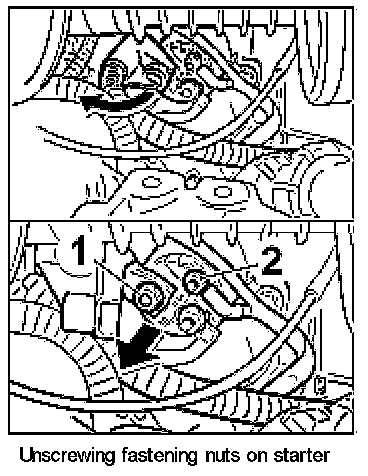 2. Unscrew fastening nuts -1, 2- on the starter, remove the leads and lay them to one side.