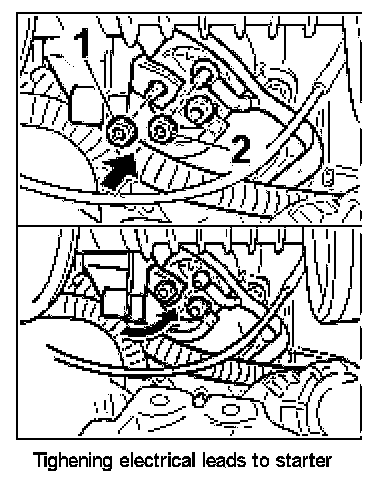 3. Position electrical leads on the starter and tighten with fastening nuts -1, 2-. Tightening torque: 13 ft.lb. Tightening torque: 5.0 ft.lb.