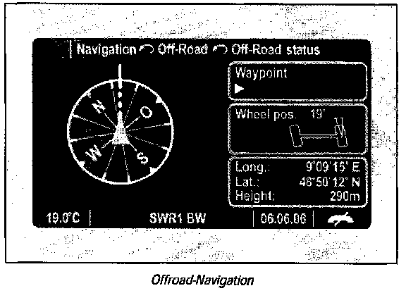 The extended navigation module is an optional module for the PCM2.1 and can be enabled by entering a code. When the extended navigation module is enabled successfully, an additional option "Off Road" appears in the PCM2.1 "Navi" menu. This allows automatic route recording and subsequent backtrace navigation (return trip on a previously traveled route) as well as navigation in non-digitally recorded areas using a compass and GPS.