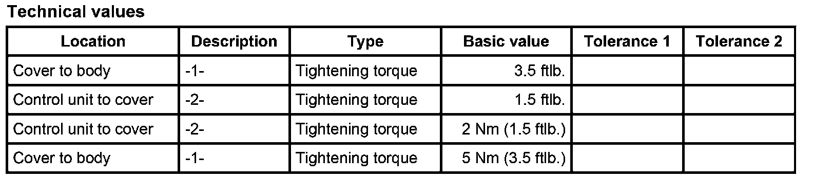 Tightening torques for telephone control unit